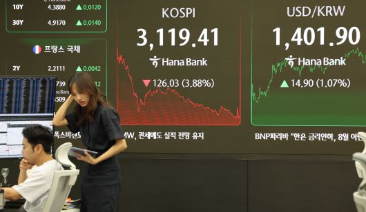 지난 1일 서울 중구 하나은행 본점 딜링룸 모습. 이날 코스피 지수는 정부의 증세 방침이 나온 이후 3.88% 급락했다./연합뉴스 |