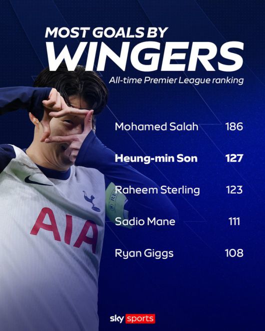 실제 손흥민은 EPL에서만 127골을 쌓았고 이는 라힘 스털링(첼시·123골) 사디오 마네(알나스르·111골)를 뛰어넘는 눈부신 통산 기록이다. 리그 역사상 가장 뛰어난 '레프트윙'으로 평가받으며 해당 포지션의 아이콘 격으로 손꼽히는 라이언 긱스(은퇴·108골)보다도 20골 가까이 많다.