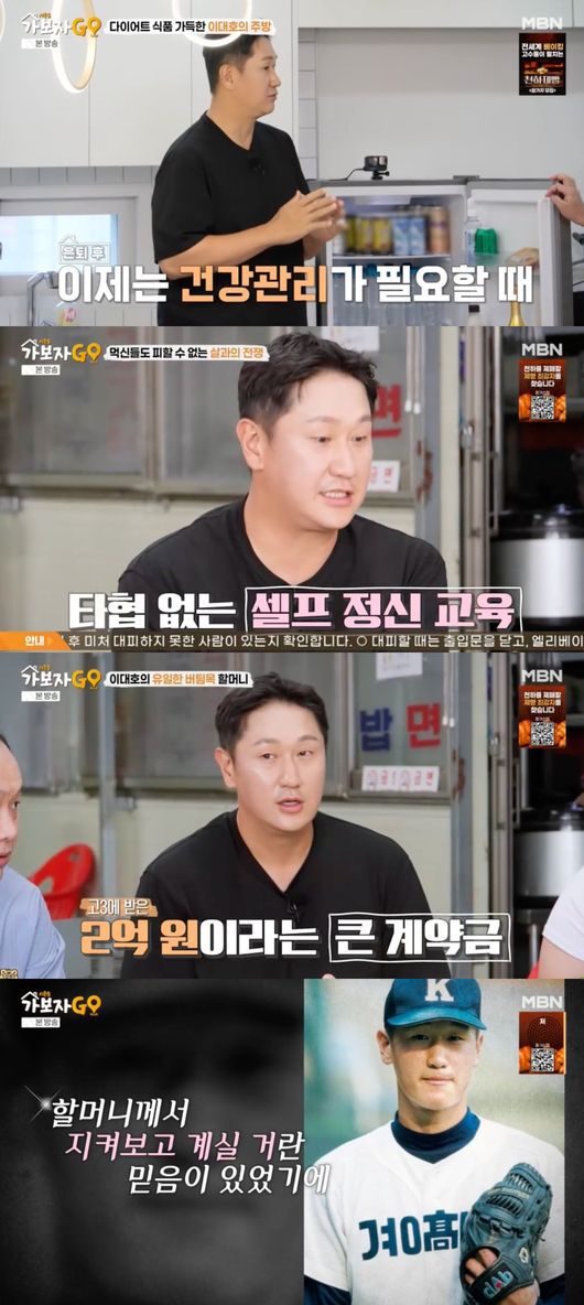 이들은 함께 이대호가 준비한 여름 보양식 메뉴를 즐긴 후, 삼겹살집으로 향해 충격을 자아냈다. 이대호는 다이어트 비법에 대한 잘문에 "먹는게 중요하다. 먹는걸 많이 안 먹었다"라며 "저는 가족들한테 고기 구워주면서 참는다. 운동할때 빼본게 있어서, ‘이것도 안 참으면 어떡하냐’ 라는 마음으로 술도 안 먹었다. 저는 뺐다가 쪘다가 해봤지만, (선수 때) 쪘을 때 더 잘한거 같다. 안 뛰게 홈런 치면 된다, 라는 생각으로 했다"라고 웃었다.