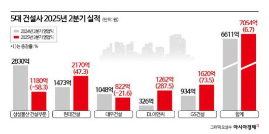 국내 시공능력평가 1~5위 건설사의 2분기 실적이 기업별로 극명한 편차를 보이며 희비가 엇갈렸다. 핵심 사업부의 원가율 관리 능력과 일회성 손익 규모에 따라 성적표가 갈린 가운데, DL이앤씨와 GS건설은 시장 전망치를 크게 웃도는 '어닝 서프라이즈(깜짝 실적)'를 기록했다. 반면 삼성물산과 대우건설은 부진을 면치 못했다. 지난해 빅배스(잠재적 부실을 손실 처리)를 단행한 현대건설은 양호한 실적을 냈다. 개별 기업의 명암 속에서도 5대 건설사 전체 합산 영업이익은 약 7054억원으로 전년 동기(약 6611억원) 대비 6.7% 증가해, 업계 전반의 수익성 개선 흐름은 확인됐다.