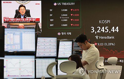 한미관세협상 타결 기대감에 주초 3,200 고지를 탈환한데 이어 장중 한때 3,280선까지 넘어섰지만, 주식 양도소득세 과세 대상인 '대주주' 기준을 50억원에서 10억원으로 낮추는 내용의 세제개편안 발표 충격에 투자심리가 무너졌다.