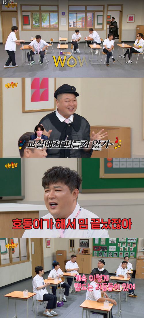 특히 게스트가 등장하기 전, '아형' 멤버들의 오프닝 토크가 펼쳐졌는데, 강호동은 "이건 첫번째 레슨 교실에서 떠들지 않기, 이건 두번째 레슨 인상 펴고 말하기, 이건 세번째 레슨 선생님 말 잘 듣기"라며 유행 중인 밈 유노윤호의 'Thank U'를 불렀다. 이에 신동은 "호동이가 해서 이거 밈 끝났다"고 했고, 이수근은 "역주행 한 걸 호동이가 따라하면 그 주에 끝나더라"며 웃었다. 이어 플레이 리스트 토크를 했고, 슈퍼주니어의 신곡 얘기를 꺼내기도 했다.