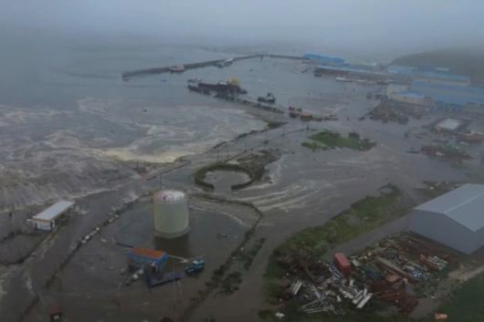 30일(현지시간) 러시아 캄차카반도 인근 해상에서 규모 8.7의 강진이 발생한 후 쿠릴열도 파라무시르섬 세베로쿠릴스크 연안에 쓰나미가 밀려들고 있다. 2025.07.30 세베로쿠릴스크 AP 뉴시스 |