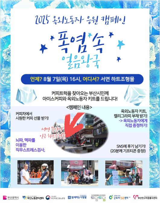 부산노동권익센터와 부산시는 여름철 불볕더위 속 야외에서 일하는 노동자를 응원하는 시민참여 캠페인 ‘폭염 속 얼음왕국’을 진행한다고 3일 밝혔다.