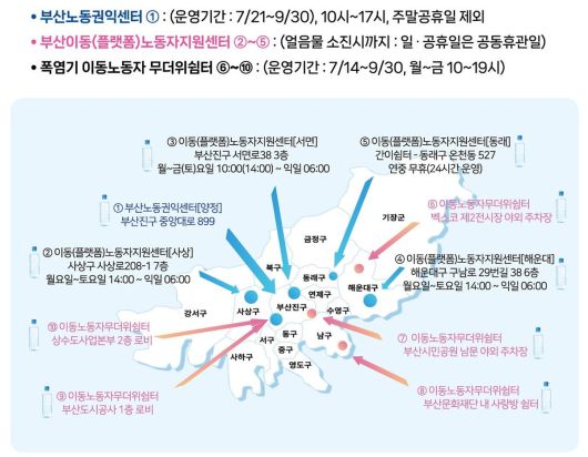 한편 부산시, 부산노동권익센터, 함께하는사랑밭, 부산고용노동청, 부산이동(플랫폼)노동자지원센터는 지난 7월 21일부터 9월 30일까지 폭염 속 부산시내 10곳에서‘노동자 쉼터’를 운영한다.