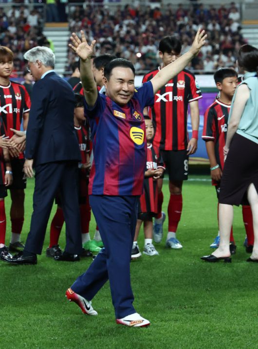 지난달 31일 서울월드컵경기장에서 열린 FC바르셀로나 2025 아시아투어 에디션 FC서울과 FC바르셀로나의 경기. 윤홍근 제네시스BBQ 회장이 인사를 하고 있다. (사진=연합뉴스) |