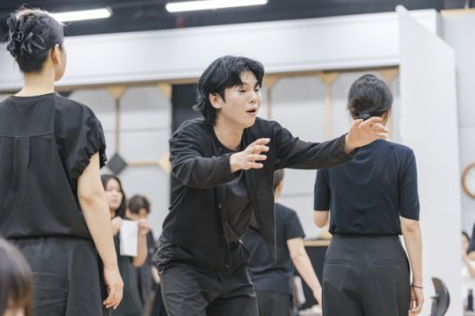 지난달 30일 서울 국립극장 연습실에서 김준수(가운데)가 심봉사 연기를 하고 있다. 국립창극단 신작 ‘심청’은 판소리 ‘심청가’를 해체하고 재해석해 심청과 심봉사의 관계를 새롭게 들여다본다. 국립극장 제공 |
