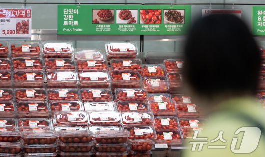(서울=뉴스1) 이승배 기자 = 최근 폭염 여파로 일부 농산물 가격이 크게 오르고 있다. 생육 부진과 수요 증가까지 맞물리면서 일부 품목은 1년 전과 비교해 40% 이상 올랐다. 3일 한국농수산식품유통공사(aT)에 따르면 수박 평균 소매가격은 지난 1일 기준 1개에 3만 3337원으로 1년 전과 비교하면 17.6% 올랐다. 토마토 소매가격은 1kg에 6716원으로 1년 전보다 42.6% 비싸고 평년보다 33.2% 높다. 여름철 가격 변동 폭이 큰 배추의 경우 1개 소매가격이 6114원으로 6000원을 넘었다. 1년 전, 평년과 비교해 각각 11.2%, 11.3% 올랐다. 3일 서울 시내의 한 대형마트에 토마토가 진열돼 있다. 2025.8.3/뉴스1