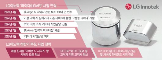 물론 LG이노텍이 라이다 사업에서 손을 뗀 것은 아니다. 지난달 LG이노텍은 미국 자율주행 기술기업 아에바(Aeva)와 전략적 파트너십을 맺고, 초장거리 주파수 변조 연속파(FMCW) 방식의 고정형 라이다를 공급하기로 했다. 2027년까지 자율주행차, 로봇 등에 적용할 공동개발도 추진 중이다. LG이노텍은 아에바 지분 약 6%도 인수했다.