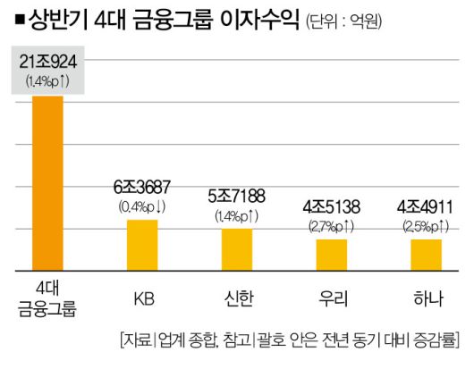 특히 4대 금융지주의 이자수익이 21조1000억원에 이르렀다. 전체 수익의 75%를 차지한다. 수도권 집값이 급등하며 주택담보대출이 늘어나는 상황에서 한국은행이 기준금리를 인하했음에도 예금금리만 재빨리 내린 채 대출금리는 거의 낮추지 않은 탓에 이익이 급증했다.