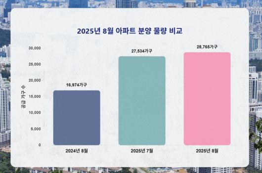 7월 분양 물량 2만7534가구와 비슷한 수준이며, 지난해 같은 기간(1만6974가구)과 올해 7월까지 월평균(1만3983가구) 공급량을 1만가구 이상 웃도는 물량이다.