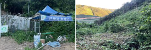 지난달 24일 이주노동자가 작업 중 쓰러져 숨진 경북 포항시 한 야산의 제초 현장. 근로자 휴게소(왼쪽)라고 적힌 그늘막이 허술하게 설치되어 있지만 제 역할을 하지 못했다. 잡초가 무성한 야외에서 일했던 이주노동자 체온은 39.6도까지 올랐다. 민주노총 금속노조 제공 |