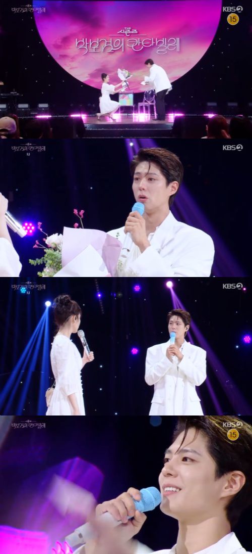 커다란 꽃다발 들고 무대에 오른 아이유는 무릎을 꿇고 박보검에게 꽃다발을 건네 감동을 안겼다. 크게 놀란 박보검은 울컥해 눈물을 흘렸고, "뭐예요 언제 왔냐"고 묻자 아이유는 "사실 아까 자이언티 씨 녹화할 때부터 같이 보고 있었다"고 밝혔다. 원래 '칸타빌레'의 애청자였다는 아이유에게 박보검은 "오늘 모시고 싶었는데 드라마 촬영이 바쁘게 진행되는걸 알고있어서 재촉하거나 또한번 부탁하지 않았다. 전혀 생각지도 예상하지도 기대하지도 않았던 아이유씨가 와 주셨다"고 얼떨떨해 했다.