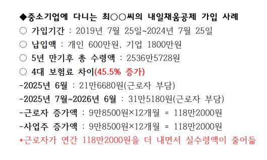 S사 대표는 "내일채움공제 만기 수령을 이유로 근로자와 회사는 4대 보험료를 매달 9만8500원씩 더 내야하는 상황이다. 1년 동안 근로자(118만2000원)와 회사(118만2000원)가 추가로 납입해야 할 4대 보험료는 총 236만4000원에 이른다. 결과적으로 근로자 입장에선 연간 118만2000원을 덜 받게 되는 셈"이라며 "내일채움공제 납부금 가운데 회사가 내는 기여금이 연봉 증가분으로 잡혀 세금(4대 보험료)을 더 내야한다는 이야기는 전혀 듣지 못했다. 회사와 직원 모두 황당해하고 있다"고 전했다.