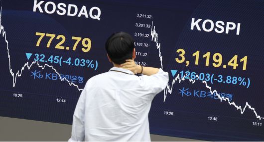 코스피와 코스닥이 세제개편안에 대한 기대감 후퇴로 4% 안팎의 큰 낙폭을 기록한 가운데 1일 서울 여의도 KB국민은행 스마트딜링룸 모니터에 코스피 종가가 표시되고 있다. 이날 코스피는 전일 대비 126.03p(3.88%) 하락한 3119.41에 마감했다. 코스닥은 전일 대비 32.45p(4.03%) 내린 772.79를 기록했다. 원·달러 환율은 달러 강세와 외국인 주식 매도에 두달 여 만에 1400원대로 급등, 서울 외환시장에서 미국 달러화 대비 원화 환율의 주간거래 종가는 전날보다 14.4원 오른 1401.4원으로 집계됐다. 신태현 기자 holjjak@ |