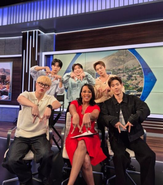몬스타엑스가 LA 아침 뉴스에 출연해 앵커와 기념촬영을 하고 있다. 스타쉽엔터테인먼트 |