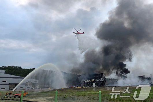 (영천=뉴스1) 최창호 기자 = 3일 오후 경북 영천시 금호읍에 있는 화학물질 취급 공장에서불이 나 소방 당국이 대응 1단계를 발령하고 진화 중이다. (경북소방본부 제공. 재판매 및 DB 금지) 2025.8.3/뉴스1choi119@news1.krCopyright ⓒ 뉴스1. All rights reserved. 무단 전재 및 재배포, AI학습 이용 금지.