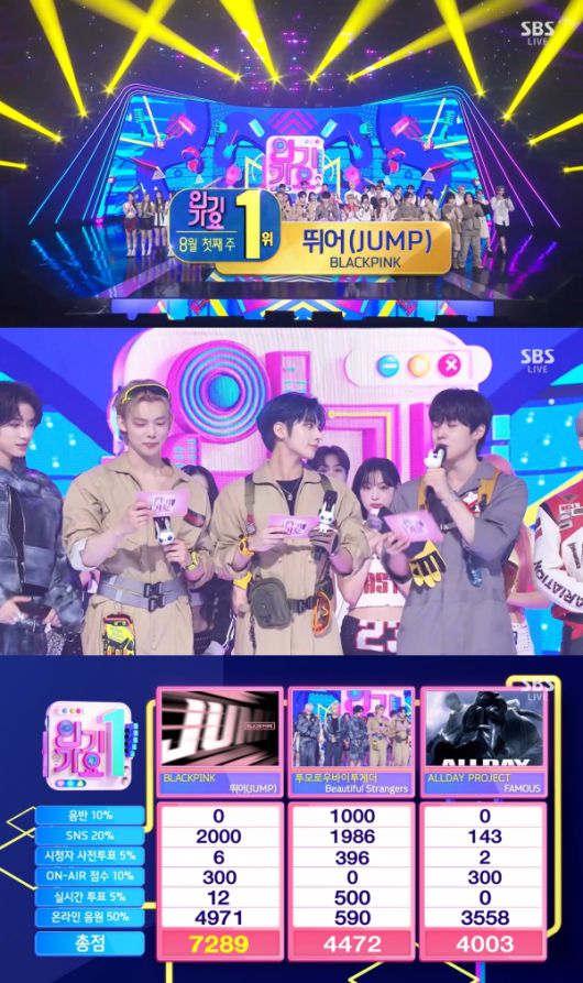 3일 방송된 SBS '인기가요'에는 블랙핑크 '뛰어 (JUMP)', 투모로우바이투게더 '뷰티풀 스트레인저스(Beautiful Strangers)', 올데이 프로젝트 '페이머스(FAMOUS)'가 1위 후보에 올랐다.