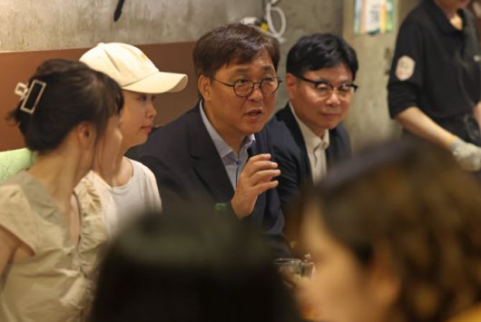최휘영 문화체육관광부 장관이 3일 서울 중구 명동예술극장을 방문해 (재)국립극단의 ‘삼매경’ 종연 공연을 관람한 뒤 한 식당에서 출연진을 비롯한 청년예술인을 만나 애로사항을 청취하고 의견을 나누고 있다. (사진=문체부 제공). |