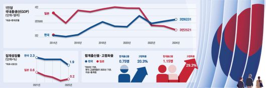 3일 한국은행 경제통계시스템에 따르면 지난해 한국의 1인당 국내총생산(GDP)은 3만6231달러, 일본은 3만2521달러를 각각 기록했다. 한국은 2014년 1인당 GDP가 처음으로 3만달러를 돌파한 이후 지난해까지 11년째 3만달러대에 갇혀 있다. 항상 한국을 앞섰던 일본은 2022년 처음으로 한국에 1인당 GDP 규모에서 역전당한 이후 지난해까지 3년 연속 한국에 뒤처졌다. 3만달러 함정에 빠진 한국과 일본의 상황은 역설적으로 새로운 협력 가능성을 더 높여준다. 국가 전체의 경제 규모에는 차이가 있지만 국민 경제 수준이 비슷하고 소득 수준뿐 아니라 지리적 접근성, 문화적 유사성까지 더해 신시장으로서 양국 협력에 무게가 실린다. 대한상공회의소는 한국과 일본의 GDP를 합해 6조~7조달러(약 8360조원) 경제권을 형성해 양국 기업의 무대를 확대하고 상호 강점을 지닌 분야에서 협력을 강화해야 한다고 주장한다. 서로가 제2의 내수 시장처럼 작용해 규모의 경제를 달성하면 저출생·고령화에 따른 인구절벽 위기 완화는 물론이고 생산성도 높일 수 있다는 게 대한상의 분석이다.