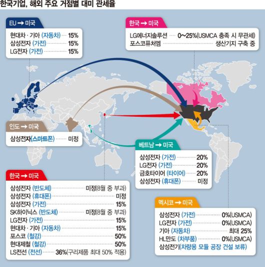 클라우디아 셰인바움 멕시코 대통령이 USMCA 조건을 충족하는 품목은 계속 무관세를 적용받는다고 밝힌 터라 자동차와 가전 분야 한국 기업들의 타격은 당장 가시화되지는 않을 전망이다. 그러나 미국으로의 수출 무관세를 충족시키기 위한 조건을 맞추는 과정에서 원재료 가격과 물류비 상승 등 부수적인 손실이 점차 늘어날 수 있어 자동차·가전·배터리 업종에선 대응책 마련이 시급하다는 지적이다.