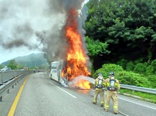 운전자 이모(63)씨는 주행 중 차량 후면에서 연기가 발생하자 갓길에 차를 세운 뒤 승객 37명과 함께 자력으로 대피했고 인명피해는 없었다.