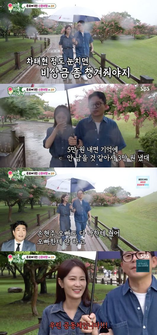 김지민은 “오빠한테 들어온 축의금 중 제일 조금 낸 게 차태현 오빠다”라며 “손현주 오빠도 다 나한테 줬다. 오빠한테 안 하고”라고 말했다. 이에 김준호는 “차태현이 최하위”라며 “자기 축의금 받은 거 조금 달라”라고 부탁했고, 김지민은 “우리 공동체다”라고 선을 그었다.