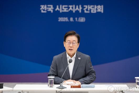 [서울=뉴스핌] 이재명 대통령이 1일 서울 용산 대통령실 청사에서 열린 전국 시·도지사 간담회에서 발언을 하고 있다. [사진=대통령실] 2025.08.01 photo@newspim.com |