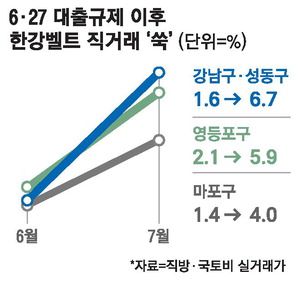 3일 부동산 플랫폼 직방이 국토교통부 실거래가 자료를 분석한 결과, 서울 아파트 거래에서 직거래가 차지하는 비중은 6월 2.4%에서 7월 4%로 증가했다. 서울 25개 자치구 가운데 17개 자치구의 직거래 비중도 전달 대비 커졌다.