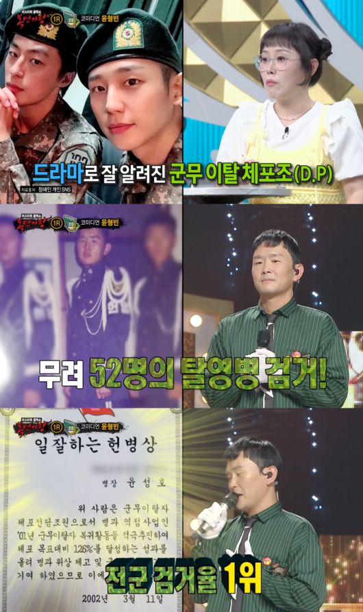 특히 윤형빈은 군 시절 ‘군탈 체포조(D.P)’로 활동한 경력을 언급하며 “52명의 탈영병을 검거해 육, 해, 공군 통틀어 전국 검거율 1위를 기록했다”고 자랑했다.