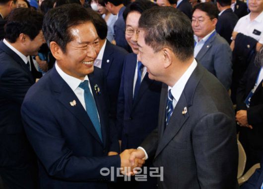 정청래 더불어민주당 대표가 2일 오후 경기 고양 킨텍스에서 열린 임시전국당원대회에서 당대표로 선출된 후 김병기 원내대표로부터 축사인사를 받고 있다. (사진=방인권 기자) |