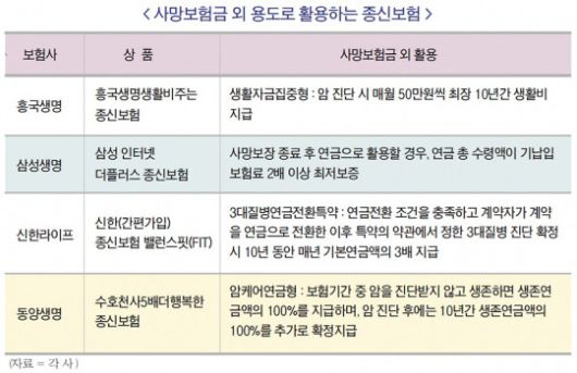 기존 종신보험이 사망 후 유가족 생활자금에 초점을 뒀다가 최근에는 질병부터 생활비까비 생존 당시 가입자가 받을 수 있는 다양한 보장 혜택을 탑재했다.