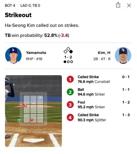 경기 초반부터 침묵으로 일관한 탬파베이는 다저스 선발 야마모토가 내려간 뒤에도 무득점에 그쳤다. 결국 9회말까지 1점도 얻지 못하면서 3점 차 패배를 받아들여야 했다.