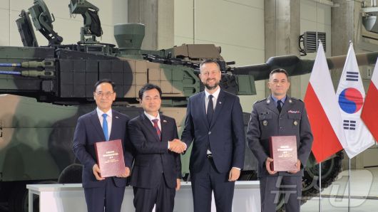 안규백 국방부 장관이 지난 1일 폴란드 글리비체에서 열린 K2 전차 2차 이행계약(전차 180대, 지원차량 81대, 약 65억불 규모) 서명식에 참석해 브와디스와프 코시니악-카미슈 폴란드 부총리 겸 국방장관, 이용배 현대로템 사장, 아르투르 쿱텔 폴란드 군비청장과 기념 촬영을 하고 있다. (국방부 제공, 재판매 및 DB금지) 2025.8.1/뉴스1 |