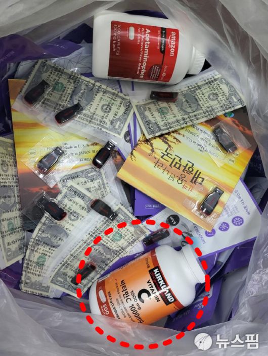 [서울=뉴스핌] 이영종 통일전문기자 = 대북전단 살포용 대형풍선에 함께 담긴 물품 가운데 K브랜드의 비타민제(붉은 원)가 보인다. [사진=자유북한운동연합] 2025.08.03 yjlee@newspim.com