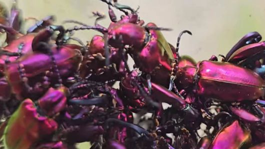 핑크색 광택을 띠는 등껍질과 굵은 뒷다리가 특징인 이 곤충은 ‘열대의 보석곤충’이라고 불리며 인도네시아 등 동남아 지역에서 주로 서식한다. 영상에서는 ‘사그라알통다리잎벌레’라고 소개됐지만, 공식적인 한국어 명칭은 아직 없다고 한다.