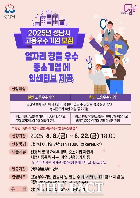 [더팩트ㅣ성남=조수현 기자] 경기 성남시는 오는 8일부터 22일까지 지역 내 일자리 창출에 기여한 중소기업을 대상으로 '2025년 고용 우수기업'을 모집한다고 4일 밝혔다.