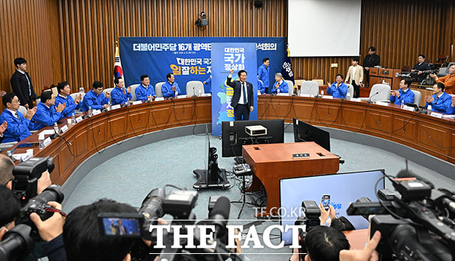 민주당 광역단체장 후보들, '승리 다짐' 전국 지도 완성 퍼포먼스 [TF사진관]