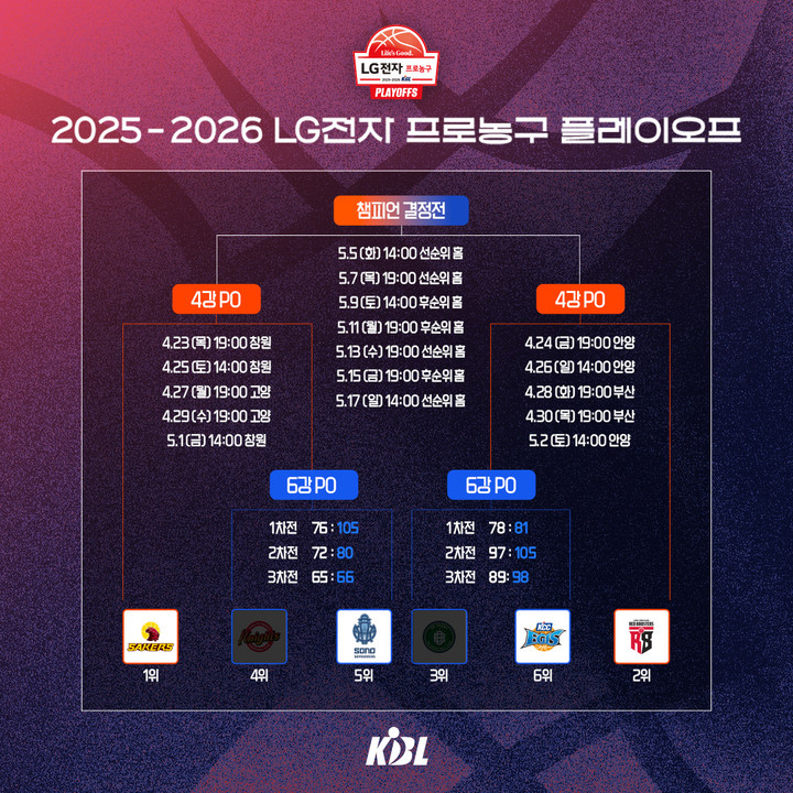 LG vs 소노·정관장 vs KCC, 박 터지게 붙는다!…KBL 4강 PO, 23일 시작