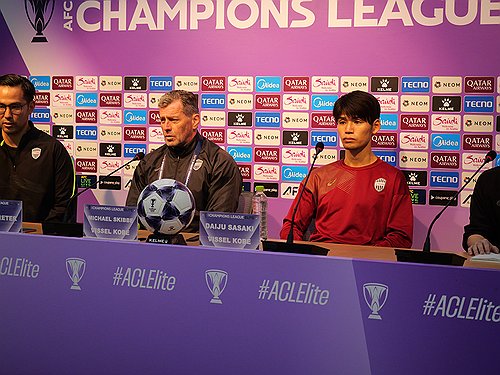 발언하는 미하엘 스키베 고베 감독