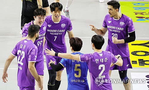 기뻐하는 우리카드 선수들
