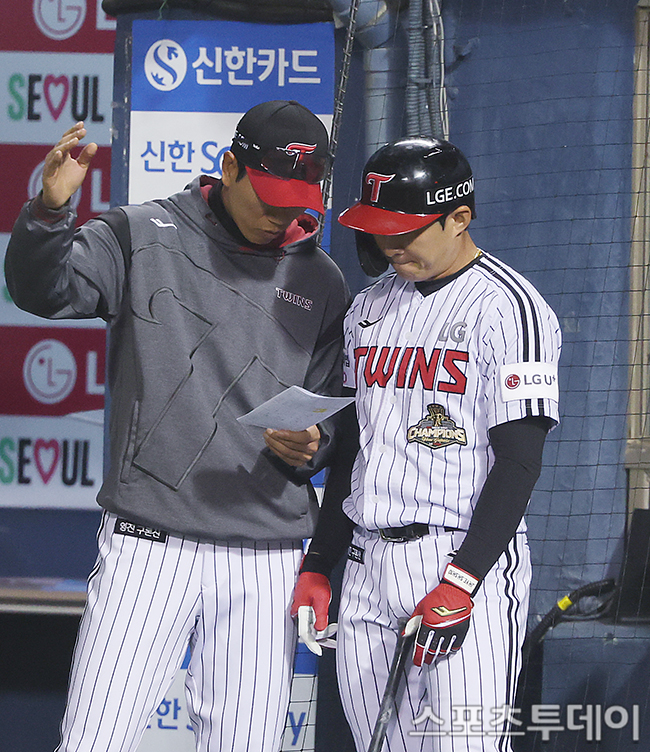 [ST포토] 오지환, 모창민 코치와 다음타선 준비