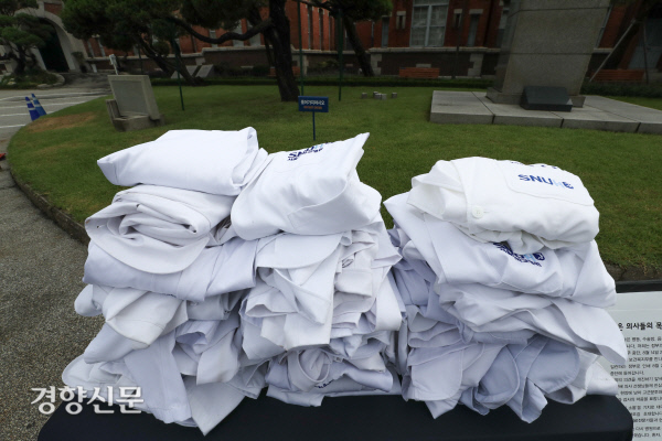 쌓여 있는 의사 가운 [경향포토]