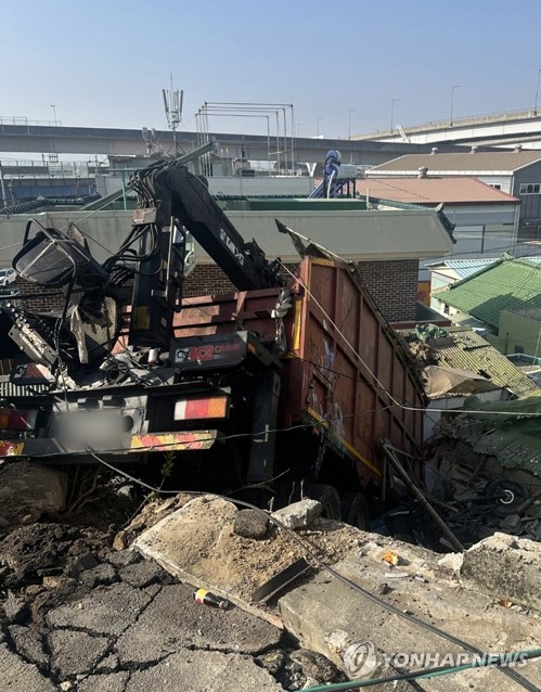 김해 내리막길 달리던 화물차, 전신주 들이받고 주택가 덮쳐