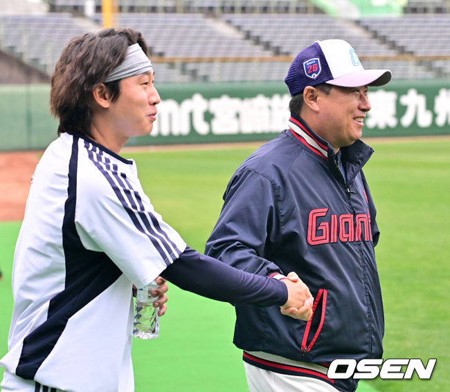 [사진]박찬호 반갑게 맞이하는 김태형 감독
