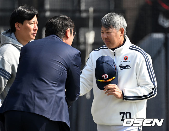 [사진]최준석 해설위원과 반갑게 인사 나누는 김원형 감독