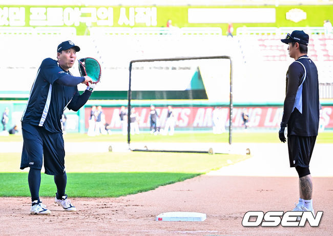 [사진]김현수,'김민혁에게 수비 노하우 전수'