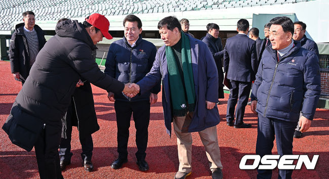 [사진] 울산 웨일즈 코치와 인사 나누는 허구연 KBO 총재와 김두겸 울산 시장